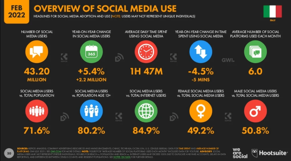 Gli italiani che usano i social network sono più di 43 milioni, ossia il 71,6% della popolazione nazionale, con una media di 1 ora e 47 al giorno.